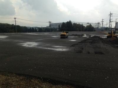造成工事も完了し砕石敷きです。約20cm敷きます。約5,000㎥の再クラを運びました。 現場事務所、仮設トイレも搬入し、工事も本格的に始まります。 来週から杭打ち工事(タッピングパイル工事)にはいります。