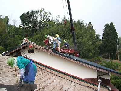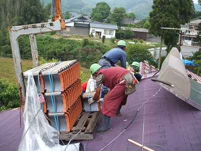 クレーンを使って瓦を屋根にあげます。瓦は木のパレットに梱包されていますが1パレット約430枚、重さにすると1トンを超えます。荷崩れに気をつけてあげます。1~2時間で完了です。