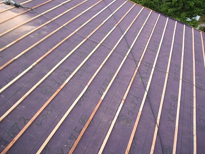 瓦下ろしが終わり次第、下地板(場板)のチェック。腐食部分があれば交換しルーフィングを張ります。最近はいろんなタイプがあり当社では殆どゴムアス製を使っています。(ゴムアス製は防水性にも優れており安心して使うことができます。…