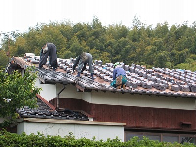 瓦の取り付け工事です。九州地区は台風が多く、瓦は防災瓦が殆どで瓦釘もステンレス製のスクリュー釘かビスを使用します。止める箇所も通常チドリ止め(7割以上)です。場所によっては全数止めます。2~3時間で完了です。