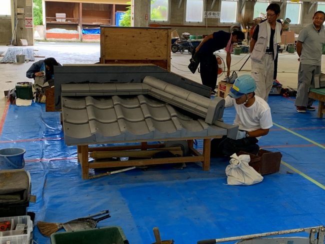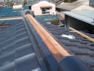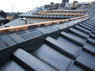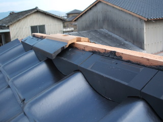 次に山城乾式面土を南蛮漆喰を使いながらステンレス線で緊結します。 今回の屋根は棟の不陸が多少ありましたので、面土を二つに割って施工しました。下地がしっかりしていると面土を割らずに工事することが出来ます。前に説明しましたが…