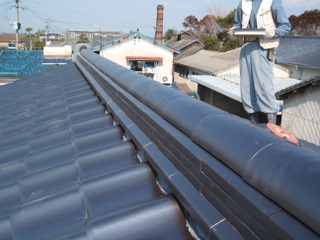 次に丸をのせて上から50㎜のビスで固定したら完成です。 この防災棟工法を使うと、ほとんどが乾式になり漆喰を使わず、台風や地震にも強くなります。勿論工事労務費も少なくなり工事店様にとっても、お客様にとっても安心して早く工事…